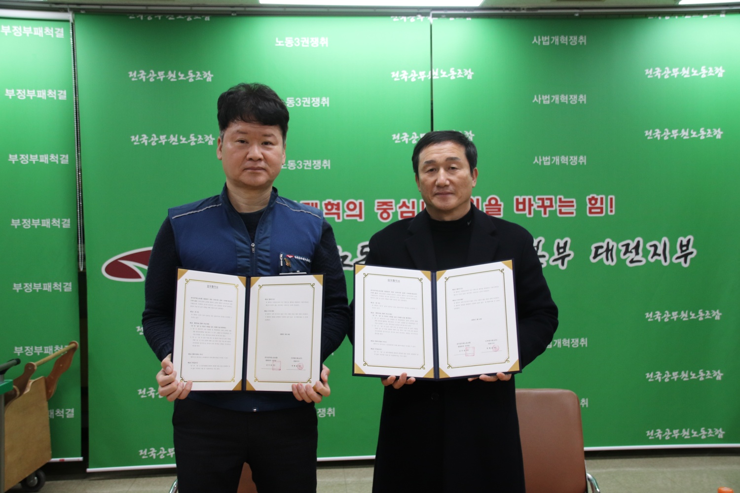 전국공무원노동조합 법원본부 대전지부와 업무 협약식을 통하여 상호간 이해증진의 기여함과 동시에 조합원 복지에 참여하고 발전적인 운용과 교류를 지향하기로 하였습니다.